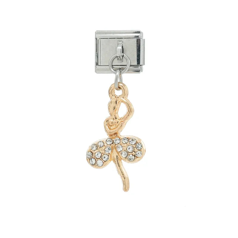 Este encantador eslabón de bailarina con brillantes en su falda es el complemento perfecto para tu pulsera italiana. El diseño elegante y femenino de la bailarina agregará un toque de belleza a tu estilo. Lleva contigo la pasión por el baile con este precioso colgante.