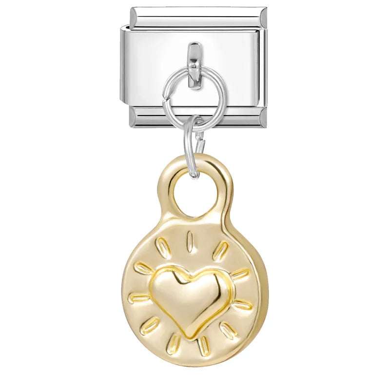 Demuestra tu amor con este hermoso eslabón con corazón. El eslabón para pulsera italiana tiene una medalla circular con un corazón radiante en color dorado, simbolizando el amor eterno. Una joya que enamorará a todos. ¡Haz que tu pulsera brille con amor!