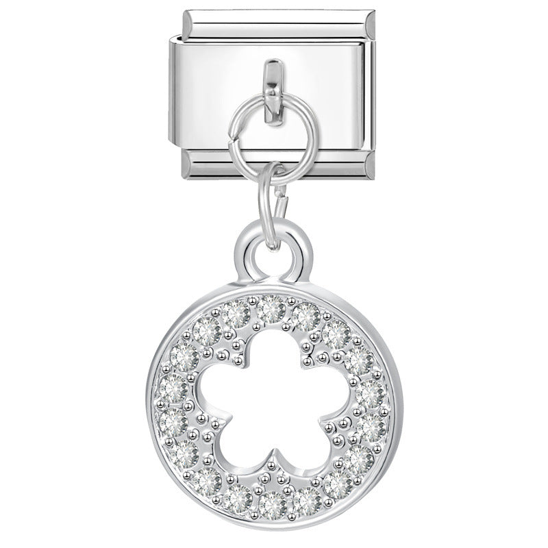 Una flor, un destello y un diseño que no pasa desapercibido. Este charm redondo con centro floral es sutil pero con punch.