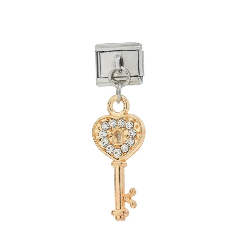 Este eslabón de llave dorada es el accesorio perfecto para tu pulsera italiana. Con brillantes y un diseño elegante, este charm añadirá un toque de estilo a tu pulsera. Haz que tu pulsera sea única con este eslabón exclusivo de llave con brillantes.