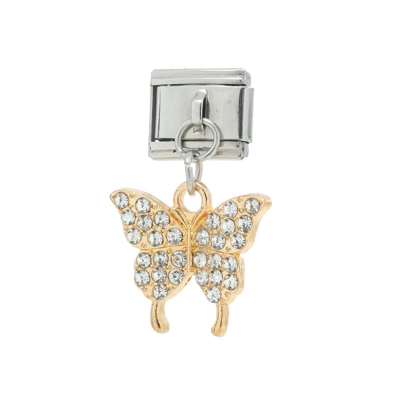 ¡Agrega un toque de elegancia y feminidad a tu pulsera italiana con nuestro hermoso Eslabón Mariposa Punta Colgante! Este eslabón presenta un diseño de mariposa adornado con brillantes, lo que lo convierte en una pieza imprescindible para cualquier amante de la moda. Transforma tu pulsera en una pieza única y llamativa con este hermoso eslabón.