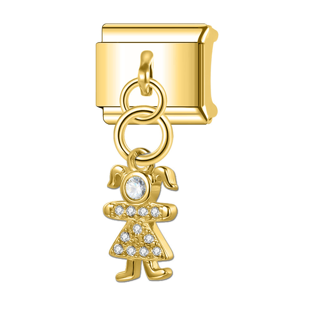 Un toque girly que ilumina tu pulsera. Este eslabón en forma de niña con vestido lleno de cristales es perfecto para recordar a tu hermana, a ti misma de chiquita o simplemente añadir dulzura a tu colección. 🎀