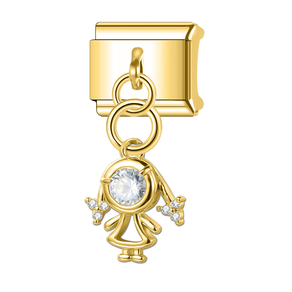 ¡La ternura se lleva en la muñeca! Este eslabón con forma de niña de trenzas y cristales brillantes es perfecto para simbolizar tu infancia, tu hermanita o simplemente ese lado dulce que te hace única. 💖