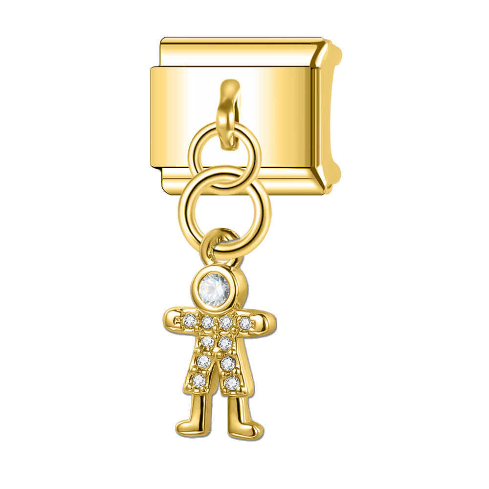 ¡Porque los niños también brillan! Este charm dorado en forma de niño con cristales en su overol es perfecto para representar a tu hermanito, hijo, primo o simplemente tu lado divertido y tierno. 🧸