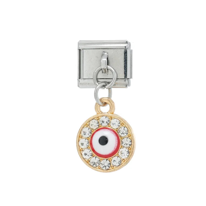 ¡Agrega un toque de suerte y elegancia a tu pulsera italiana con nuestro eslabón de ojo rojo colgante! Este eslabón hecho con brillantes es perfecto para protegerte contra el mal de ojo y atraer buena fortuna. ¡Haz que tu pulsera sea aún más especial con este hermoso eslabón!